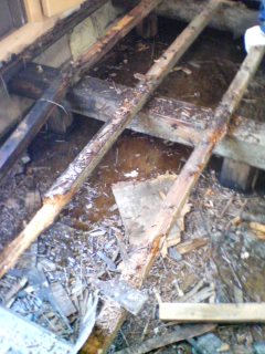 畳下地はカビで前面黒くなり、その下の根太や大引・束まで影響がありました。この、和室で寝られた方のお体を心配します。 |